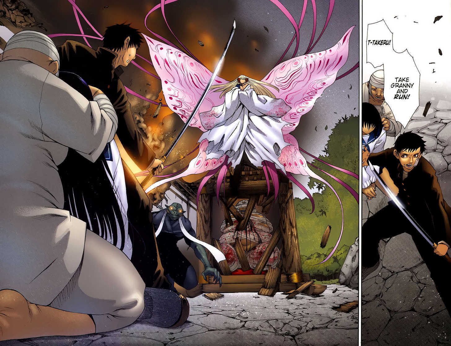 Takeru drags Gakura's upper torso, or all that is left of him, to Fuura and demands she let her grandmother and Kou's dad go. She then changes back and asks if she is half demon. She then learns from Fuura, who is grief stricken because of what happened to Gakura, that Takeru is indeed half demon. Her father, who is actually Master Hougen, impregnated her mother with a demon egg. So, that his child could bare the witchblade. Fuura also says the reason they feed on him is that he tortured and used them as lab rats so they are now punishing him for it. Fuura then turns into a large butterfly like deamon and begin to attack a now stocked Takeru. Takeru's grandmother shields her only to get stabbed by Fuura bringing Takeru our of her shock and she begin to fight Fuura.